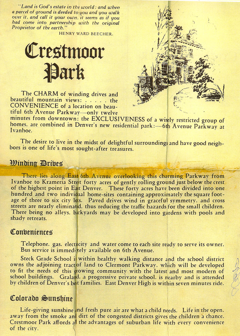 (Image from an early sales brochure. Reprinted in Crestmoor Park Heritage by Alice Millett Bakemeier.)