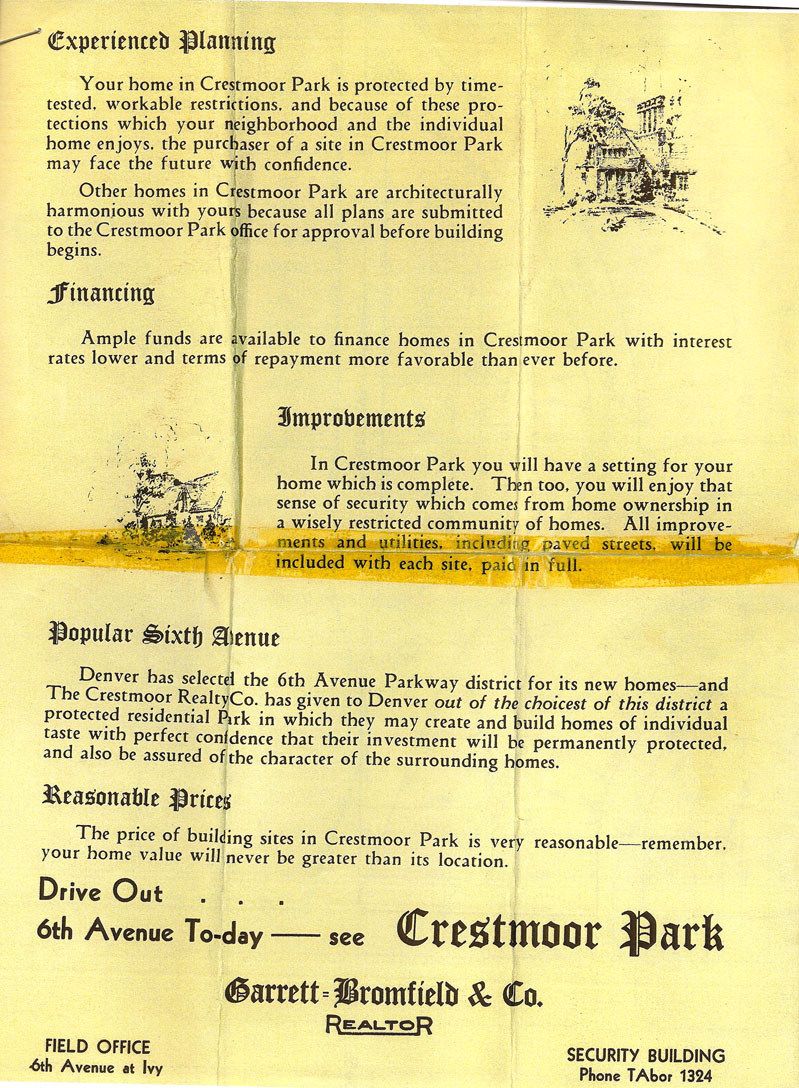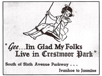 (In 1936 a temporary sales office was put up on 6th Avenue at Ivy Street. Reprinted in Crestmoor Park Heritage by Alice Millett Bakemeier.)